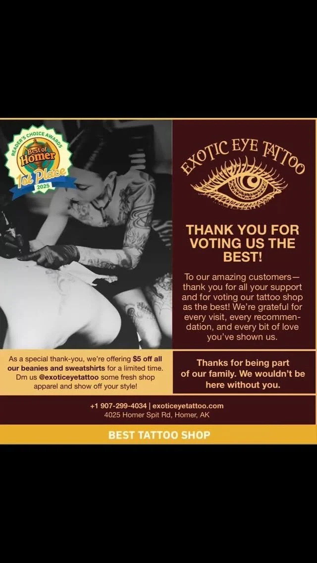 Every tattoo is more than ink, it’s a living story carried on your skin. At Exotic Eye, we blend artistry, ritual, and intuition to craft pieces that honor who you are and what you carry. From bold designs to fine-line detail, each tattoo is a collaboration between spirit, place, and person.